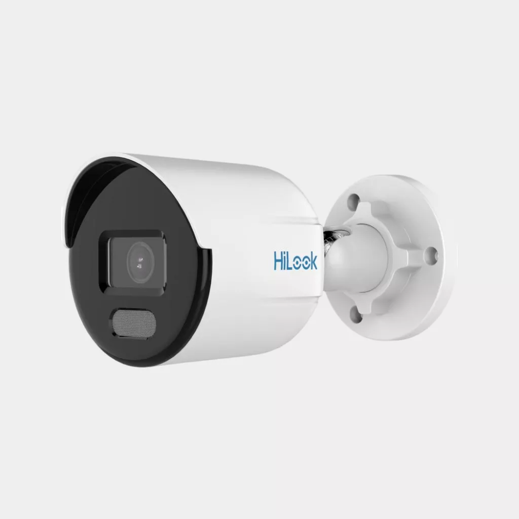 كاميرا IP خارجية HiLook بدقة 4 ميجابكسل مع تقنية ColorVu لرؤية ملونة 24/7، إضاءة بيضاء حتى 30 مترًا، وصوت عبر الشبكة، مثالية للمداخل والمركبات الخارجية.